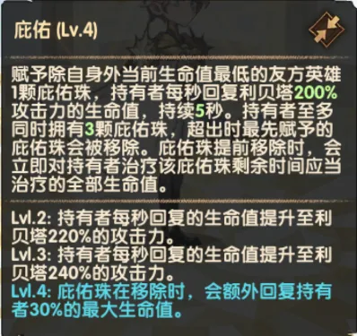 赋予除自身外当前生命值最低的友方英雄庇佑珠,每秒会恢复生命值,持续性恢复技能。庇佑珠移除时,还能瞬间获得大量治疗效果。