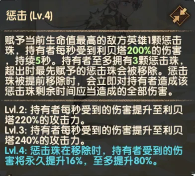 赋予当前生命值最高的敌人惩击珠,会造成持续性伤害。惩击珠移除时,还能瞬间造成大量伤害。
