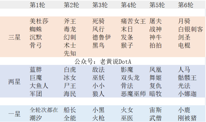 最后附上老黄收集整理的目前6轮命定英雄组合,十分凑巧的是,怀旧服和先锋服的轮次是刚好对上的,这里也算是一波千里眼了,可以知道后面的命定池子情况。