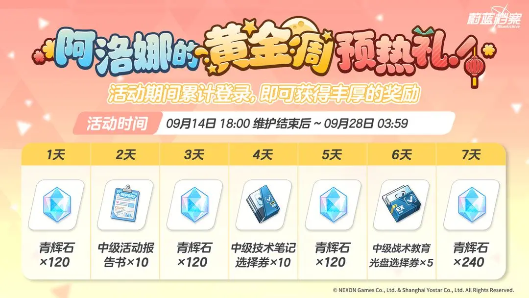活动期间累计登录,即可获得阿洛娜为老师准备的丰厚黄金周预热礼物!