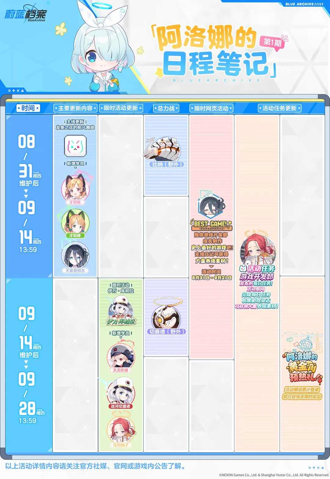 日程笔记仅供老师参考未来版本更新后活动内容及招募时间内容,具体活动规则还请老师关注后续官方社媒及游戏内、官网公告。下方附带了当期版本日程笔记长图,其中包含了期间的活动开放时间安排,以供老师参考~