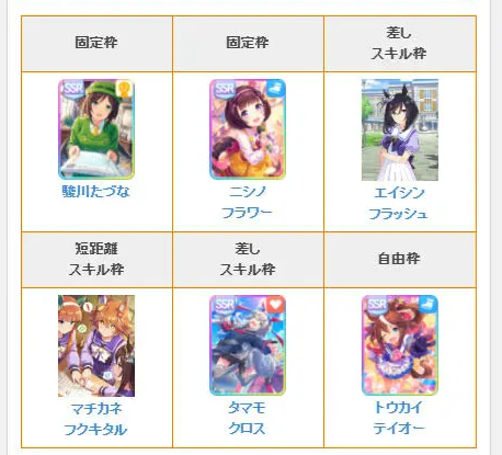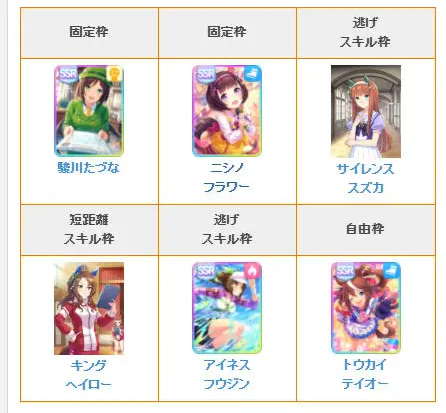 乌拉拉(春丽):游戏中少有的泥马,在泥地比赛可以获得更多的粉丝。同时,因为是差马但是又是短距离型导致育成的目标相对其他马来说更低更容易达成。同样训练难度低,技能学习参考更多插入/冲刺型技能。