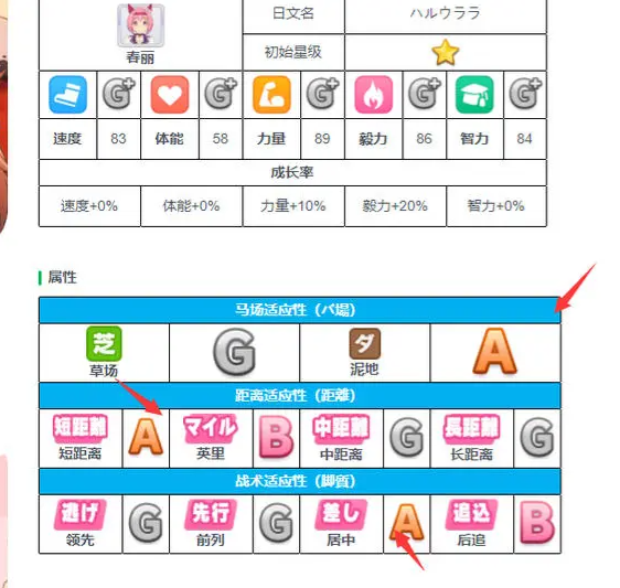 那么现在我们就明白了要根据对应比赛的数据(场地 距离)来有针对性的训练提升马娘,除此之外马娘的选择也是重要的一环