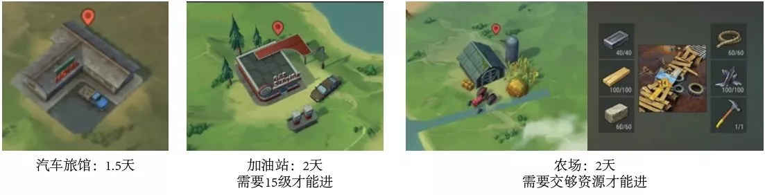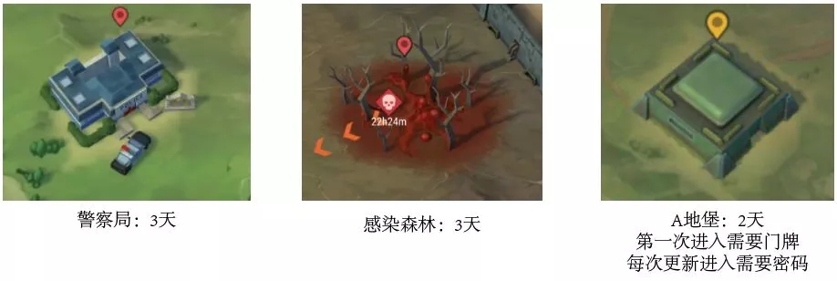 6.地图中标志性的建筑:家、邻居(3个NPC家)、A堡、B堡(未开放)、C堡(未开放)、旧农场、警察局(现警察局需要去瞭望塔解锁)、汽车旅馆、加油站、受感染的森林、第七区。每个地图的介绍可以查看文章 “地球末日生存-地图介绍”。