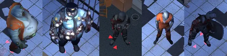 暴乱僵尸:150血,防御较高,伤害较高,带有盾牌,会举盾牌,用盾牌攻击,建议找合适机会攻击,可以卡墙。