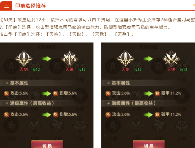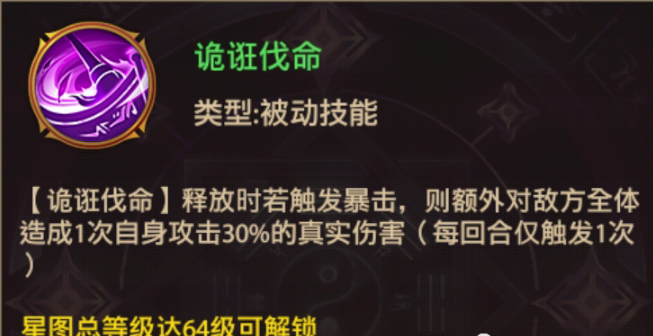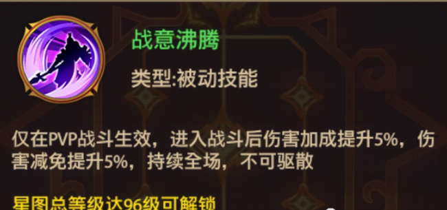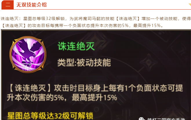 《铁杆三国》魔司马懿无双养成推荐白喵岚岚发布于 2023-08-24关注 诡诳伐命:星图总等级64级解锁,强化武将魔司马懿的技能【诡诳伐命】,使该技能暴击时,额外对敌方全体造成1次自身攻击30%的真实伤害(每回合仅触发一次)。 战意沸腾:星图总等级96级解锁,无双系统专属技能,所有星图满级武将都可以获得,在任何PVP战斗生效,提升战斗伤害5%,提升伤害减免5%。 防御型【印痕】选择:【天驱】、【天固】、【天誓】、【天愈】。