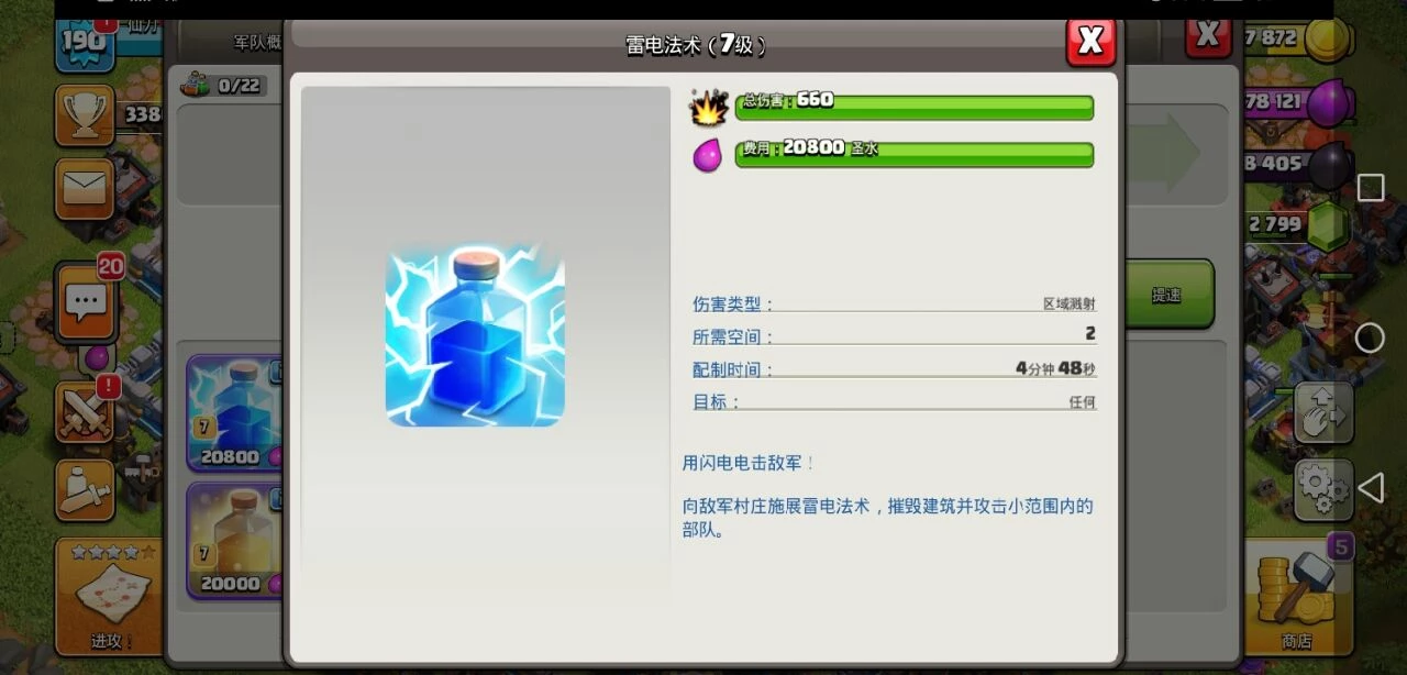 首先就是我们的雷电法术。雷电法术是我们解锁的第一个法术也是最早获得的一个,它的主要作用呢就如同上面的介绍。用闪电电击地军向敌军村庄,施展雷电法术,摧毁建筑,并小范围的攻击敌方部队。这个法术的作用十分大,可以说是贯穿了部落冲突的前期中期和后期。首先就是前期它能用来攻击敌方的部队并进行补刀比如你正在攻击敌方,已经打了49%还差一点就能获得一行但是你的兵种都已经死完了,这时你就可以使用雷电法术,攻击地方的工人小屋,顺利拿到一星并撤离战斗。到了游戏中期它可以用来攻击的方防空火箭,并顺利的进行空军来摧毁敌方军队。到了游戏的后期这个法术的作用就会变的最大。它可以用来清理敌方援军,清理防空火箭。清理百分比。可以说是一个十分重要的法术。