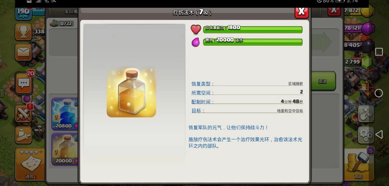 第二个为大家介绍的是治疗法术。它可以恢复全员的血量,去让他们保持战斗力,并释放疗伤法术,产生的治疗光环会让在其中的部队恢复大量血量。这个法术同样十分热门,他不管是在低本,还是中本,还是高本,都有着一席之地。低本玩家可以让前排回复血量并能抗更多的伤害,中高端玩家用它来配合狂暴进行一个输出和恢复。比如说矿工流野猪流,治疗法术都是不可缺少的一个法术。