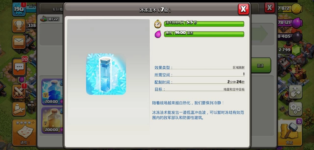 接下来为大家介绍的是冰冻法术,这个法术在低不是很受欢迎,许多萌系玩家不知道他有什么用或者是该怎么用。因为游戏初期冰冻法术世家的冰冻效果很短也基本上就是一瞬间的事。所以说很多新手玩家觉得他是一个鸡肋。其实不然冰冻法术也是一个比较重要的法术。冰冻法术在十一二本用的次数非常多甚至超过了雷电法术。因为十本以上就会解锁一个新的防御建筑叫做地狱塔。地狱塔的单头射线会在短短的几秒内对你的前排军队造成极大的伤害,这时候就需要冰冻法术的登场了。他可以冻结地狱和她并让她的单透射线攻击范围短时失效。也就是说它可以瞬间刷新地狱火塔的单头射线,把他伤害重新变成最低。它也可以用来去冰冻十二本大本营的伤害。不过在等级没有起来的情况下不是很推荐新手用这个法术。