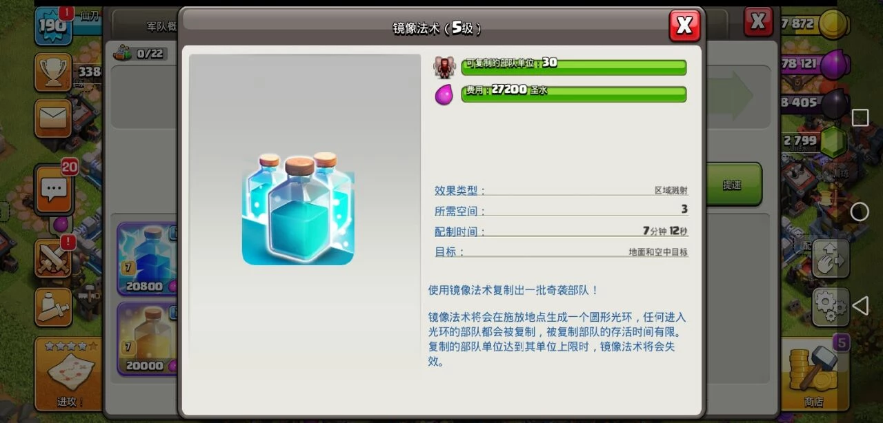 本期最后一个为大家的介绍的是镜像法术。镜像法术会在地图上生成一个圆形光圈,进入光圈的部队会被复制。被复制的时间有限,复制的部队单位达到其上限是镜像法术失效。他你的镜像法术可以复制三十个兵种你就只能复制六个巨人,因为巨人的格子为5。这个法术相对比较冷门运用的玩家很少。常见的运用阵容为。哥布林邪教,狗球,武神。镜像法术一般配合骷髅法术用会有奇效。至于剩下的法术会在下期为大家一起介绍。