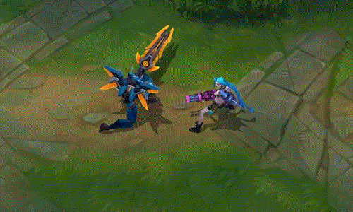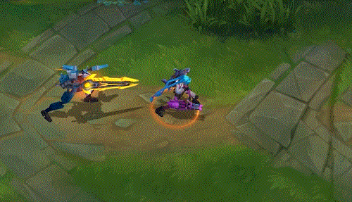 亚托克斯持续为他的热能利剑充能,充能完毕时剑柄处会散发闪闪微光,使亚托克斯下次普攻用正面直刺的姿势造成额外伤害,并散发橙色的粒子特效,同时吸收敌人身上绿色的光颗粒用于治疗自身。