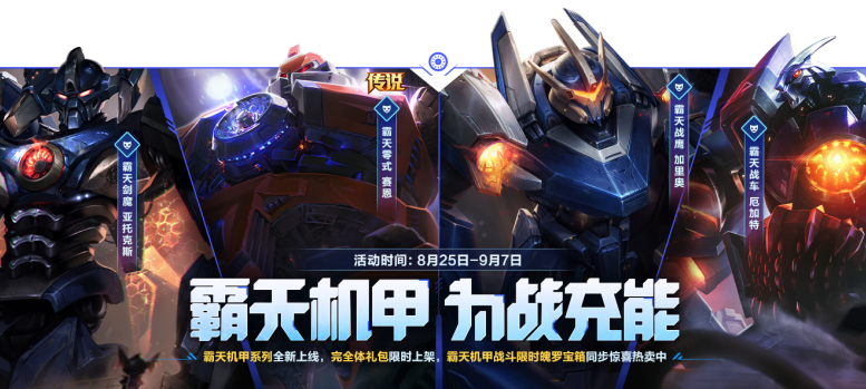 至此所有霸天系列新皮肤都爆料完毕,4款新皮肤都将会在8月25日0:00解锁!并将以商城直售、大礼包、完全体礼包、限时魄罗宝箱4种形式同步售卖,召唤师可以选择喜欢的方式获取哟~