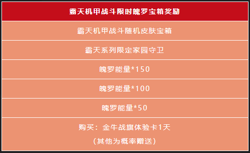 霸天机甲战斗限时魄罗宝箱每开启10次至少获得1个霸天机甲战斗随机皮肤宝箱,累计开启100次至少获得10个霸天机甲战斗随机皮肤宝箱以及霸天系列限定家园守卫。若召唤师已拥有所有霸天系列皮肤,则必定获得魄罗王天选随机皮肤宝箱。