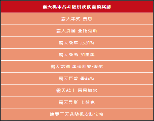其中,开启霸天机甲战斗随机皮肤宝箱将获得皮肤奖励,具体奖励内容如下: