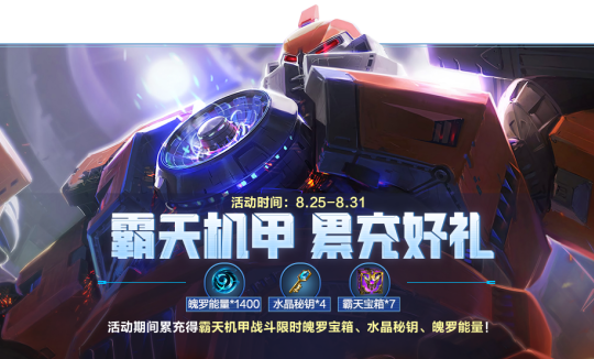 新皮肤上架,还将伴随新活动“霸天机甲 累充好礼”一起上线~8月25日-8月31日,召唤师充值点券达到指定数额,即可领取额外奖励。具体奖励内容如下: