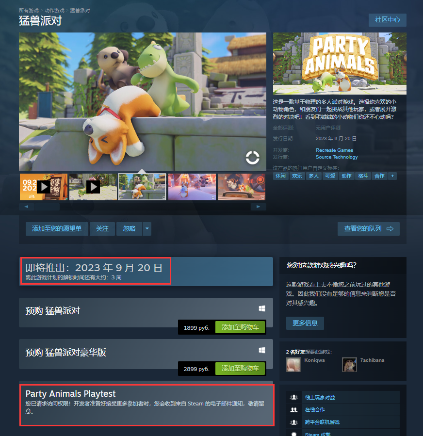 《猛兽派对》PC免费测试开启报名!首轮测试9.1开启!光环摆渡人发布于 2023-08-25关注根据《猛兽派对》steam官方页面显示,游戏分别将于9.1-9.3、9.8-9.10、9.15-9.19于Steam开启三轮免费测试,感兴趣的玩家可以自行前往了解。同时本作也将于9.20在PC端发售,标准版定价98元。同时,游戏官方也于早前透露本作将在PC端正式上线后,着手开发手游版,感兴趣的小伙伴们不妨预约一手游戏,以便后续第一时间获取最新游戏相关消息。