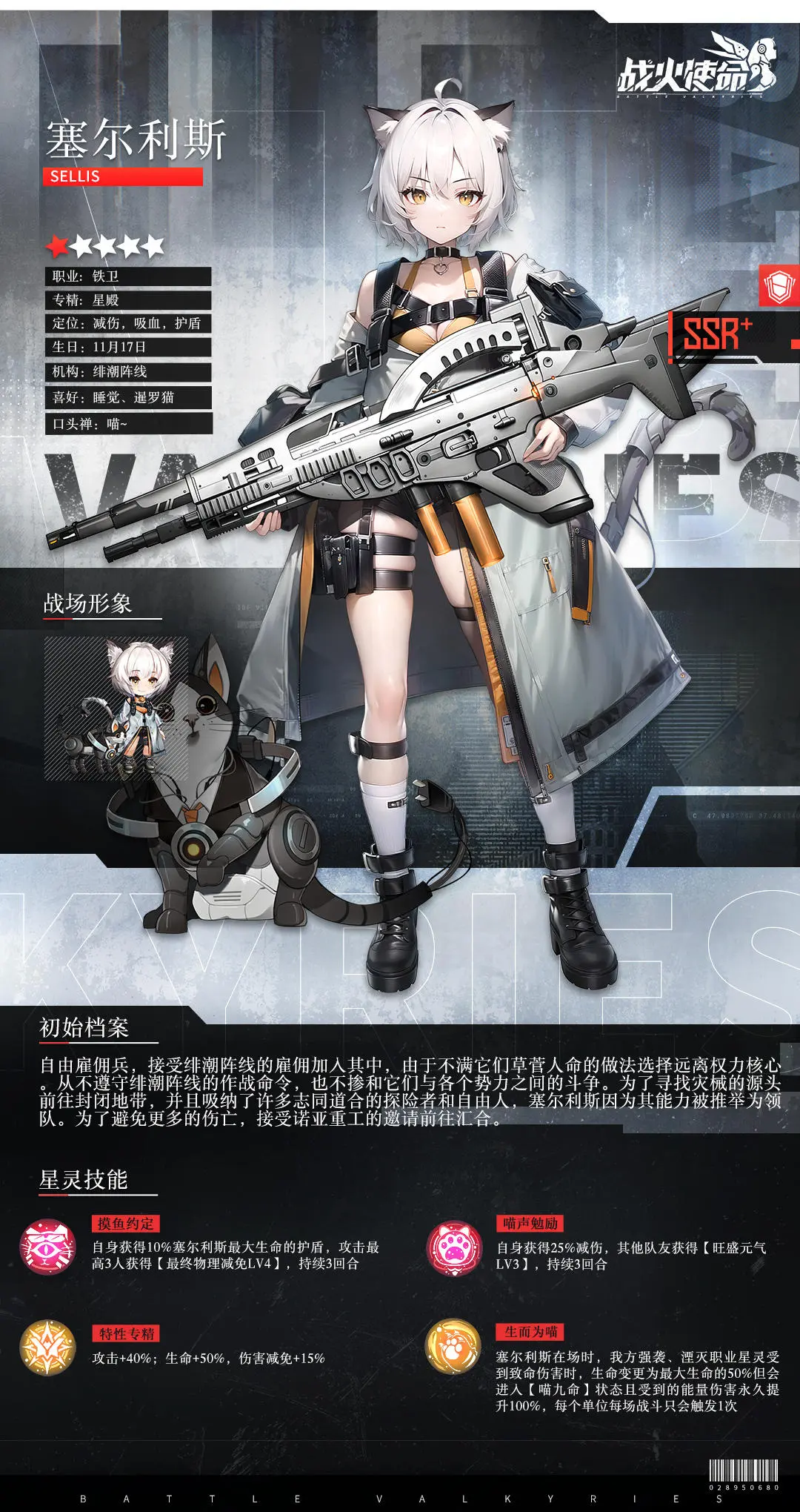 角色攻略 | “喵?喵?喵?”『塞尔利斯』角色解析白喵岚岚发布于 2023-08-25关注※观前提示※本角色wiki内容处于逐步完善阶段,仅供司令官参考,最终信息请以首发时为准。〓角色基础信息〓 〓角色定位&技能详情〓