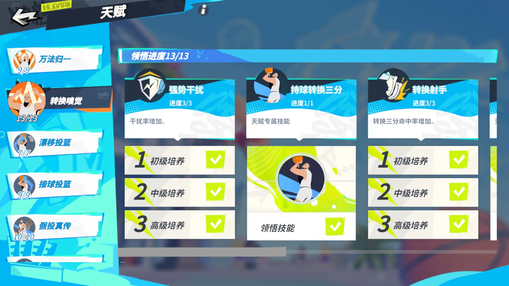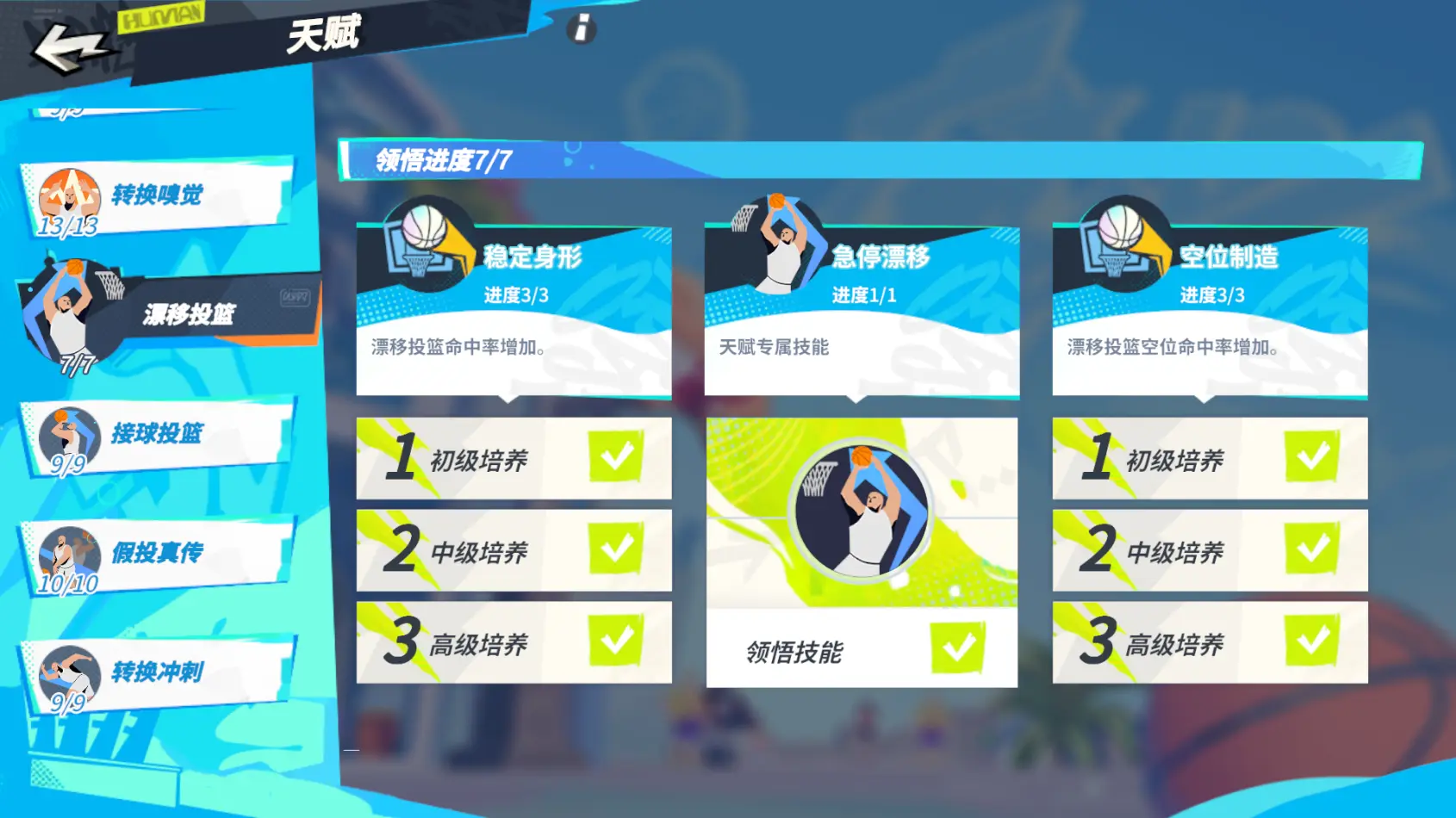 【漂移投篮】可以提升技能投篮及空位命中率,解锁技能专属天赋【急停飘逸】后,球员使用漂移投篮,可以往反方向漂移,提高防守难度。
