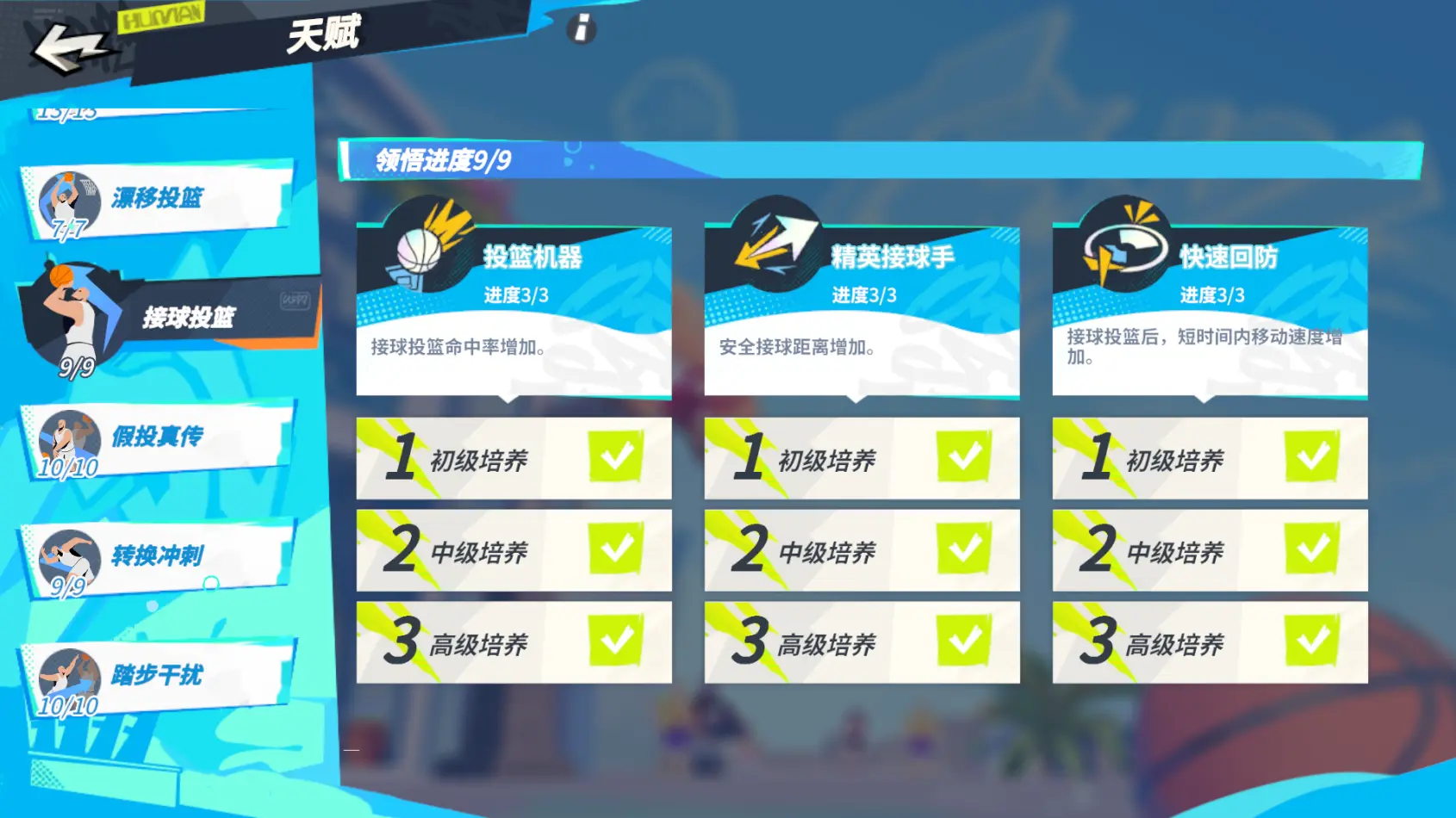 【接球投篮】天赋,提升技能投篮命中率,增加接球时的安全距离,防止被对手拦截抢断,还可以让球员在接球投篮后短暂地增加移动速度,方便攻守转换时的快速回防。