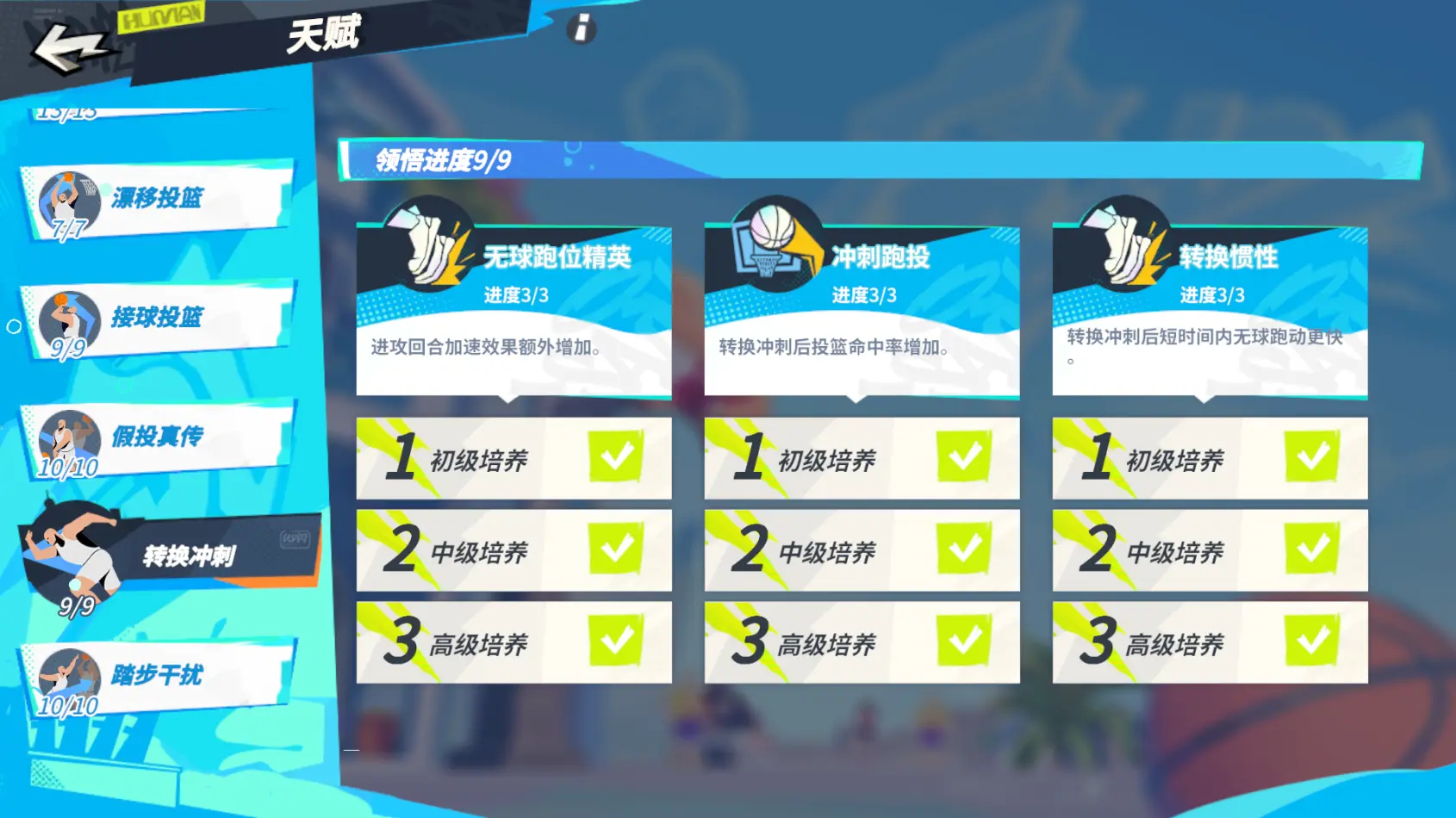【转换冲刺】天赋,提升进攻回合加速效果,够提高转换冲刺之后接球投篮的命中率,还会让技能无球跑动时的速度更快,更容易甩开对方防守。