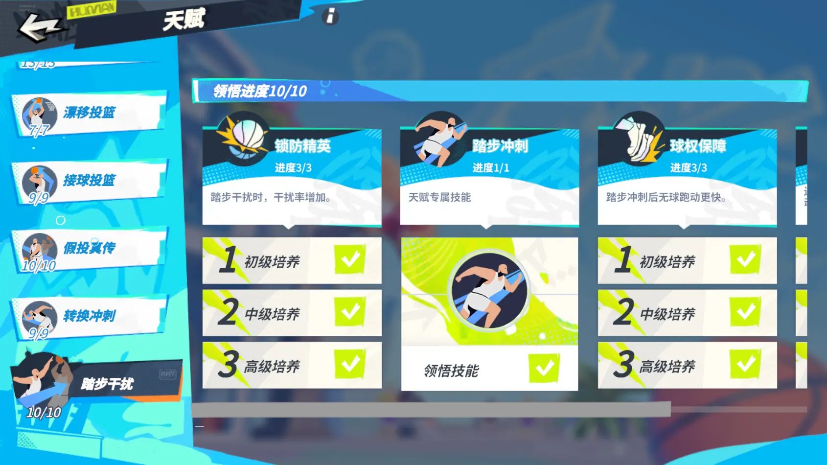 【踏步干扰】天赋,可以增加干扰率,提升技能使用后无球跑动的速度以及强化被动效果。