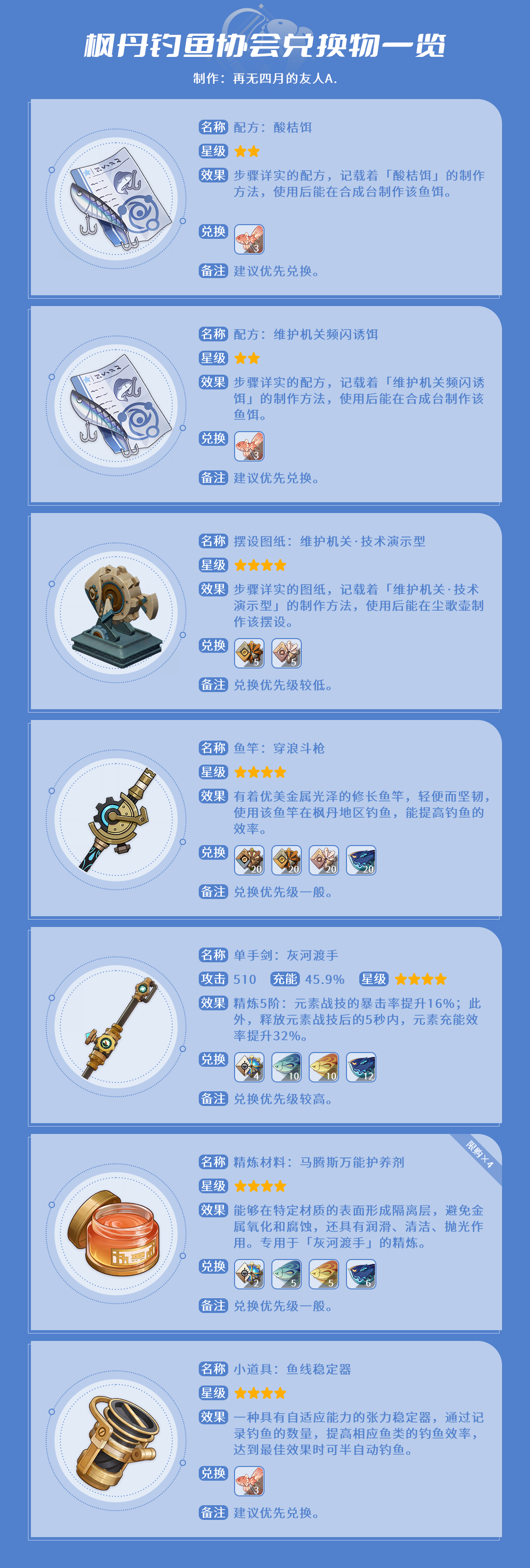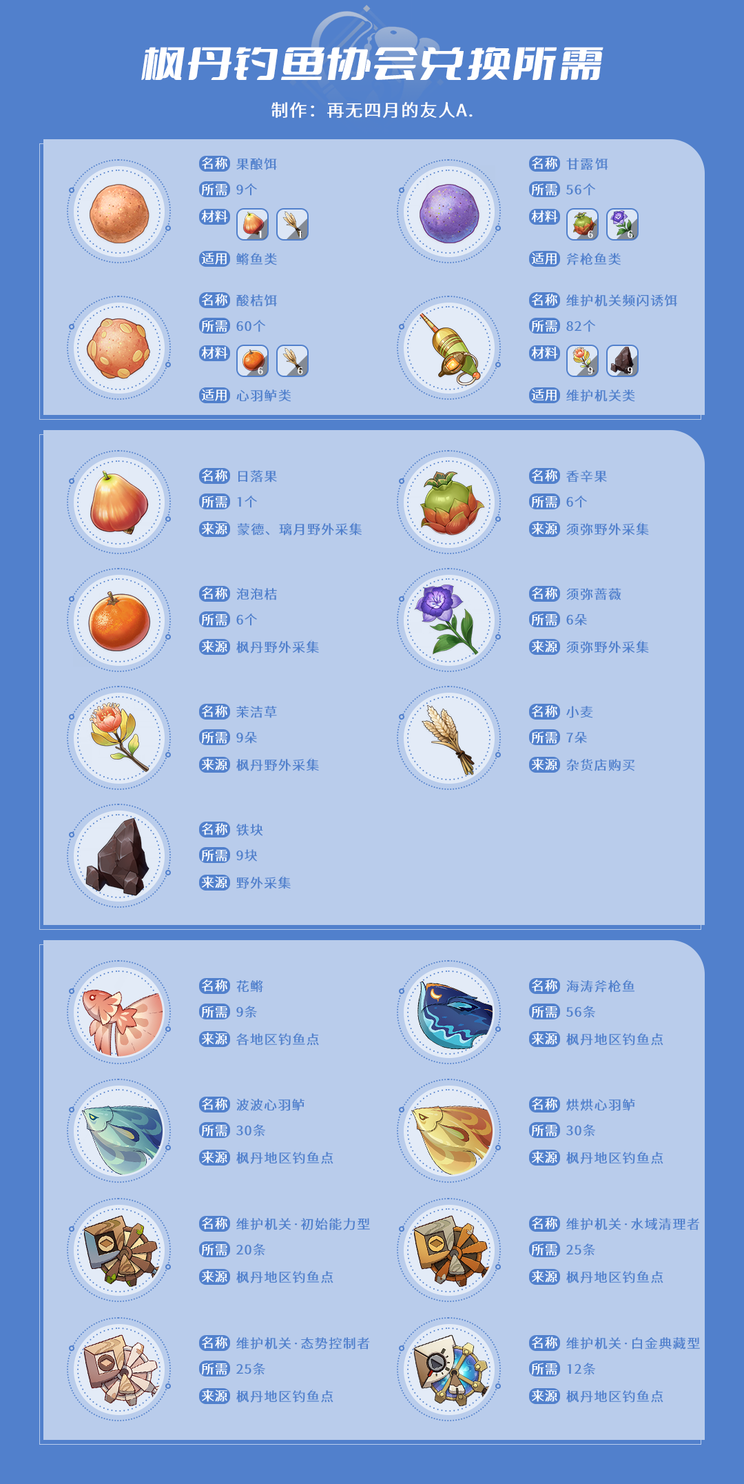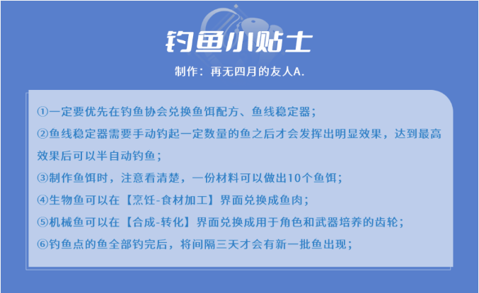旅行者们好,今天给大家带来4.0枫丹地区(白露区、枫丹廷区、苍晶区)的钓鱼点详情,同时也对兑换枫丹钓鱼协会商店里的所有物品所需的鱼类数量以及鱼饵数量进行了简单的计算。