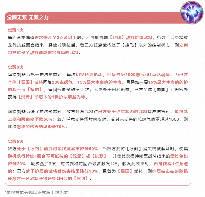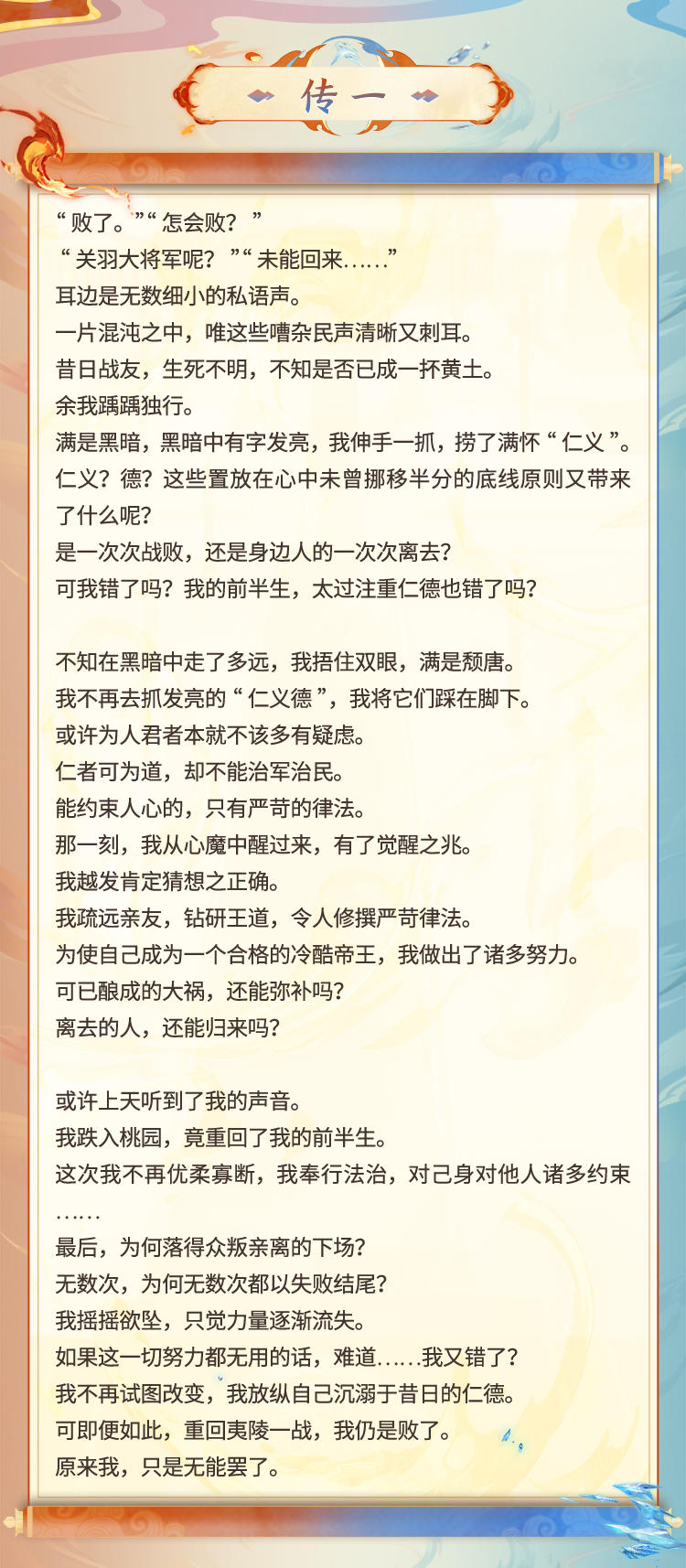 夷陵之战后,刘备纠结自己前半生是否因为太过“仁德”和注重“情义”耽误王道之路,心魔折磨下他悟出“若要成王道需轻义”的道理,也因此觉醒了“龙魂之力”。刘备认为贯彻“无情”对巩固龙魂之力和王道有关,所以即使众人劝阻,他仍然一意孤行,刻意让自己成为一个真正“冷酷、合格”的帝王。