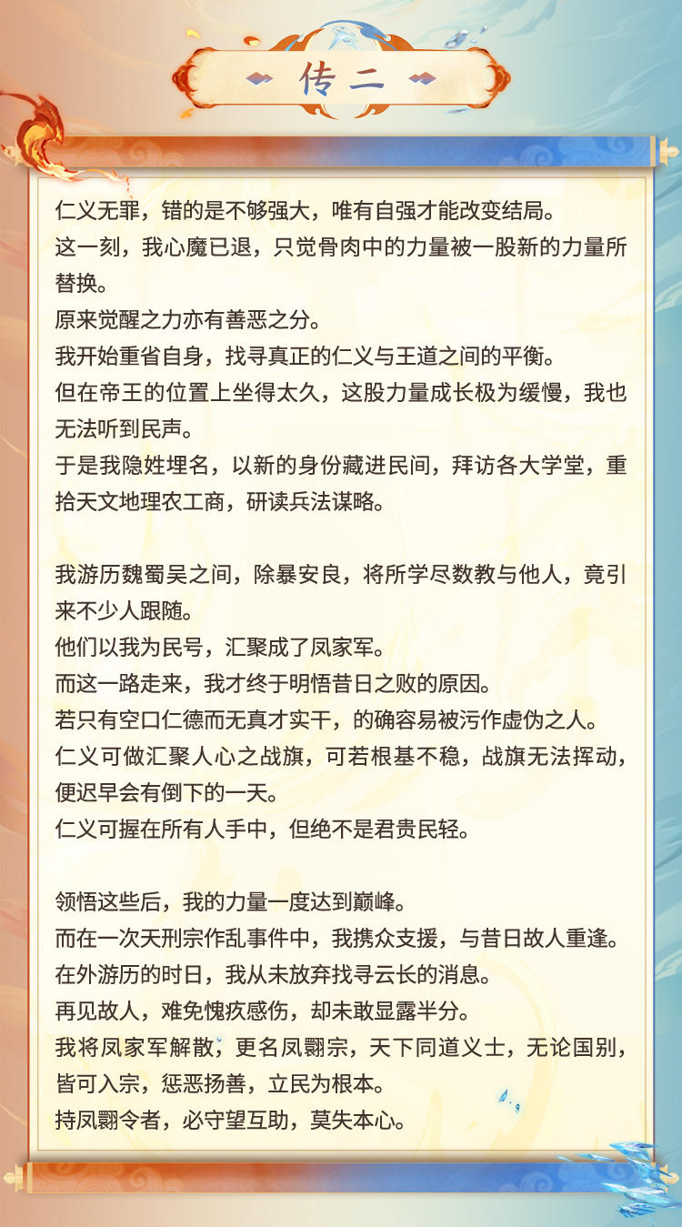 真正觉醒后,凛煜刘备隐姓埋名,以新的身份“凤叔”隐入民间,拜访各大学堂,虚心成为大龄学童,研读兵法与谋略,学习天文地理农工商。以自己逐渐增强的、纯粹的个人能力吸引了不少人的赏识和认可,获得了不少新生代英雄豪杰的跟随,这些人自称是“凤家军”。后凛煜刘备主动解散“凤家军”,更名为“凤翾宗”,命人打造“凤翾令”交给所有“凤翾宗”的人,让他们回到自己的国家继续为家乡做贡献。由于志同道同之人不论国家都可以加入“凤翾宗”,“凤翾令”也因此很快遍布了大江南北。