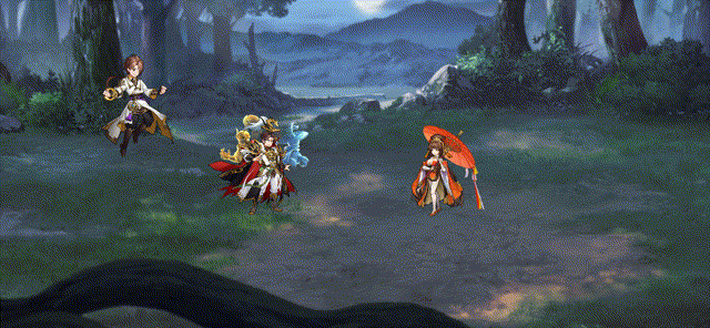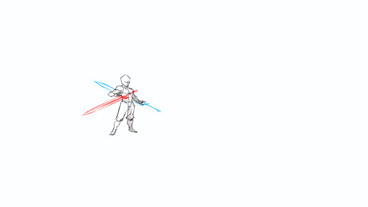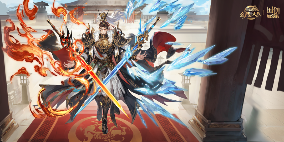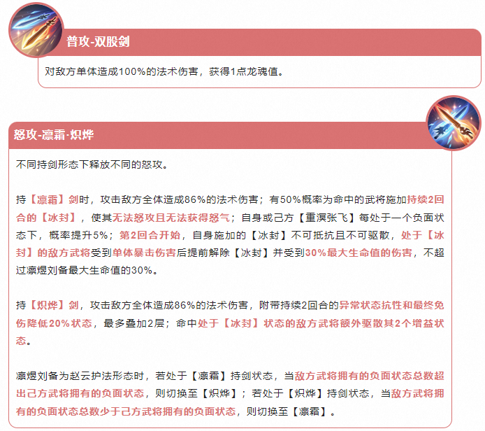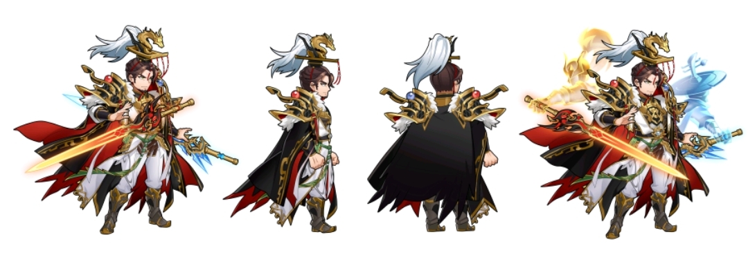 凛煜刘备的技能设计主要是为了展现出他自身的两种性格:炽热的情谊与冰冷的王道。这两点在龙魂技中以最直观的方式表现出来——冰火双剑同时出现,并在第一段打击后浮现出凛煜刘备的两个造型虚影,一个是帝王相,一个是江湖相。它们以同样的方式向下打击,冰火特效混合,暗示凛煜刘备的两种性格在自身达成的平衡与和谐。其他技能中的动作设计要点为速度快、果断有力。除近战的怒攻外,都是以幅度不大的上身动作为主,为的是能够展现出凛煜刘备身为帝王的统领气质,突出他的沉稳和果决。