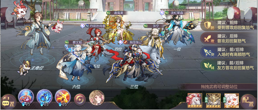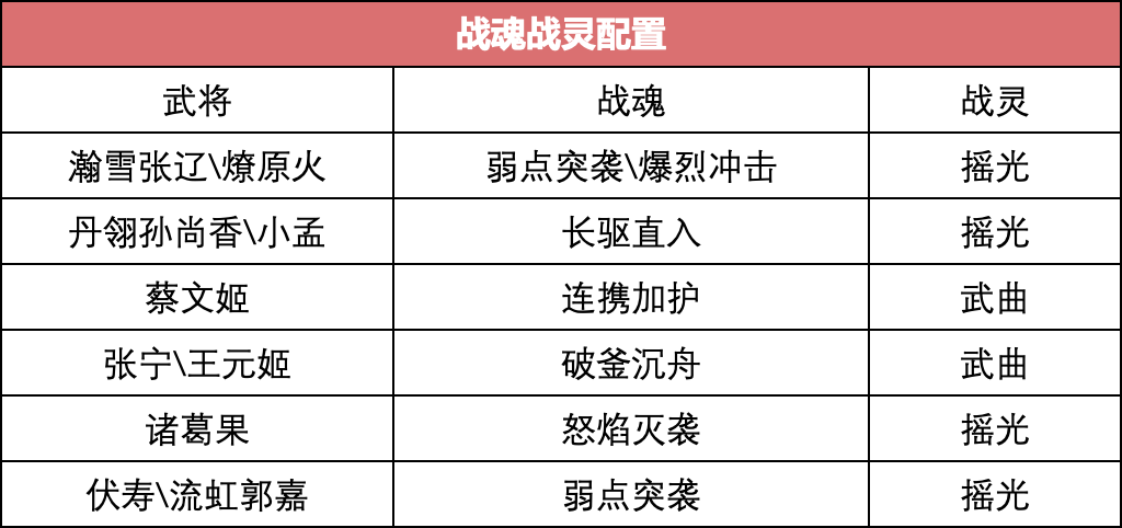 3.中期成型阵容:瀚雪张辽(乐进护法)+张宁+伏寿诸葛果(5火配专武)+丹翎孙尚香(马云禄护法)+蔡文姬(专武+命魂觉醒)