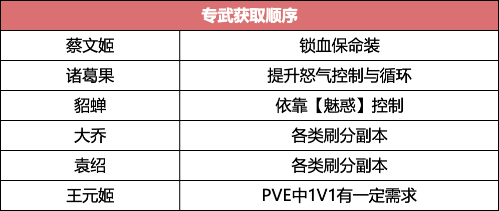 ④第二个月的基金最后一天有专武自选,可补强前期急缺的专武。⑤综合神将养成顺序,前期专武推荐获取顺序为: