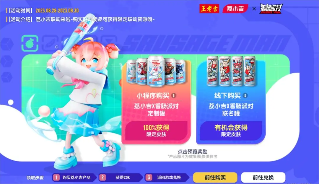 购买香肠派对×荔小吉联名饮料 就有机会获得联动皮肤奖励,还包括专属的能量双枪联动皮肤!