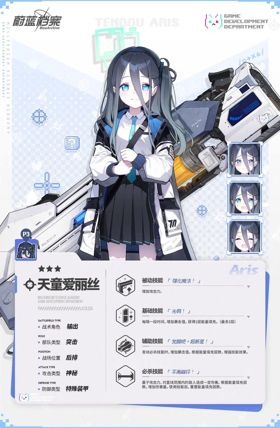 【新增人物档案】天童爱丽丝白喵岚岚发布于 2023-08-28关注 //////////档案启封//////////■天童爱丽丝千禧年游戏开发部的成员。在废墟发现的来历不明的少女,无法查到包括年龄在内的所有情报。一直跟着桃和绿打游戏的她,已经成了重度游戏迷。原本说话很呆板,但现在常常用复古游戏的台词代替。“我遇到了大家,学会了什么是游戏和友情。老师会教给爱丽丝什么事情呢?”