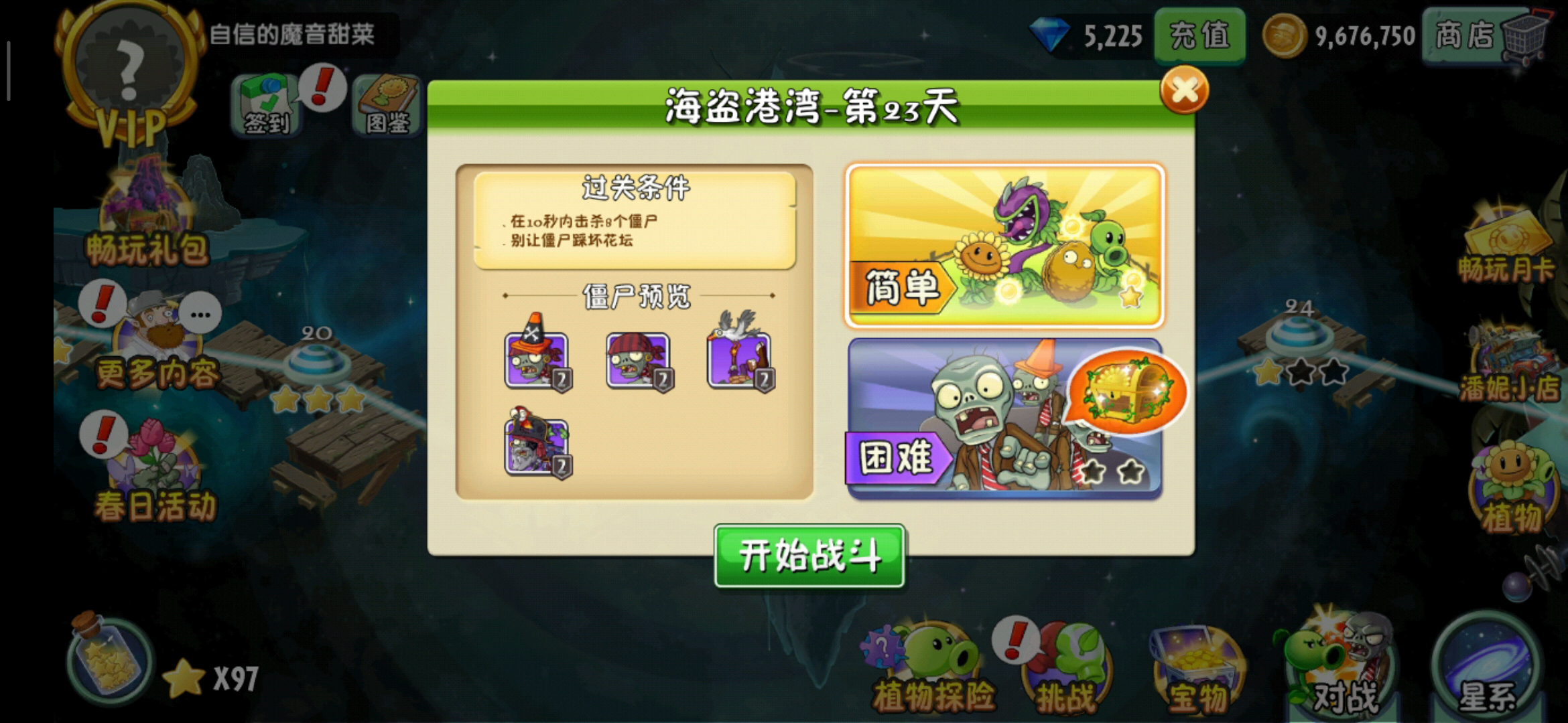 保护的任务万无一失了,击杀任务也是唾手可得,10秒内击杀8头僵尸这个任务的完成方法有很多的,可以选择在前期完成,用岩浆番石榴在坚果前面炸掉大波僵尸,因为岩浆番石榴的攻击范围是九个格,所以可以一次性消灭大量僵尸,加上其他植物的攻击击杀也能凑到八头僵尸。或者我们可以直接等到后期种植上的高伤害的植物后,依靠它们的高伤害输出也能完成这任务。