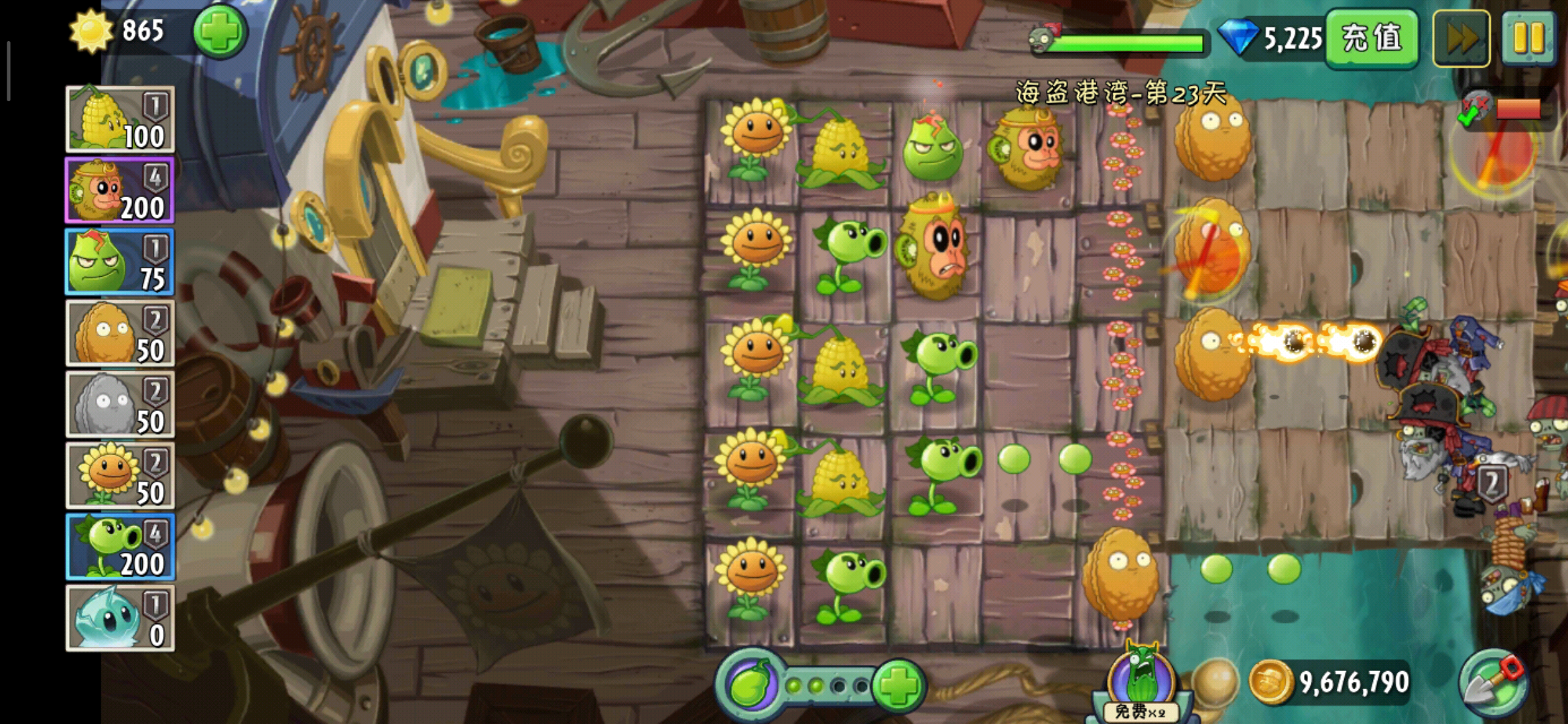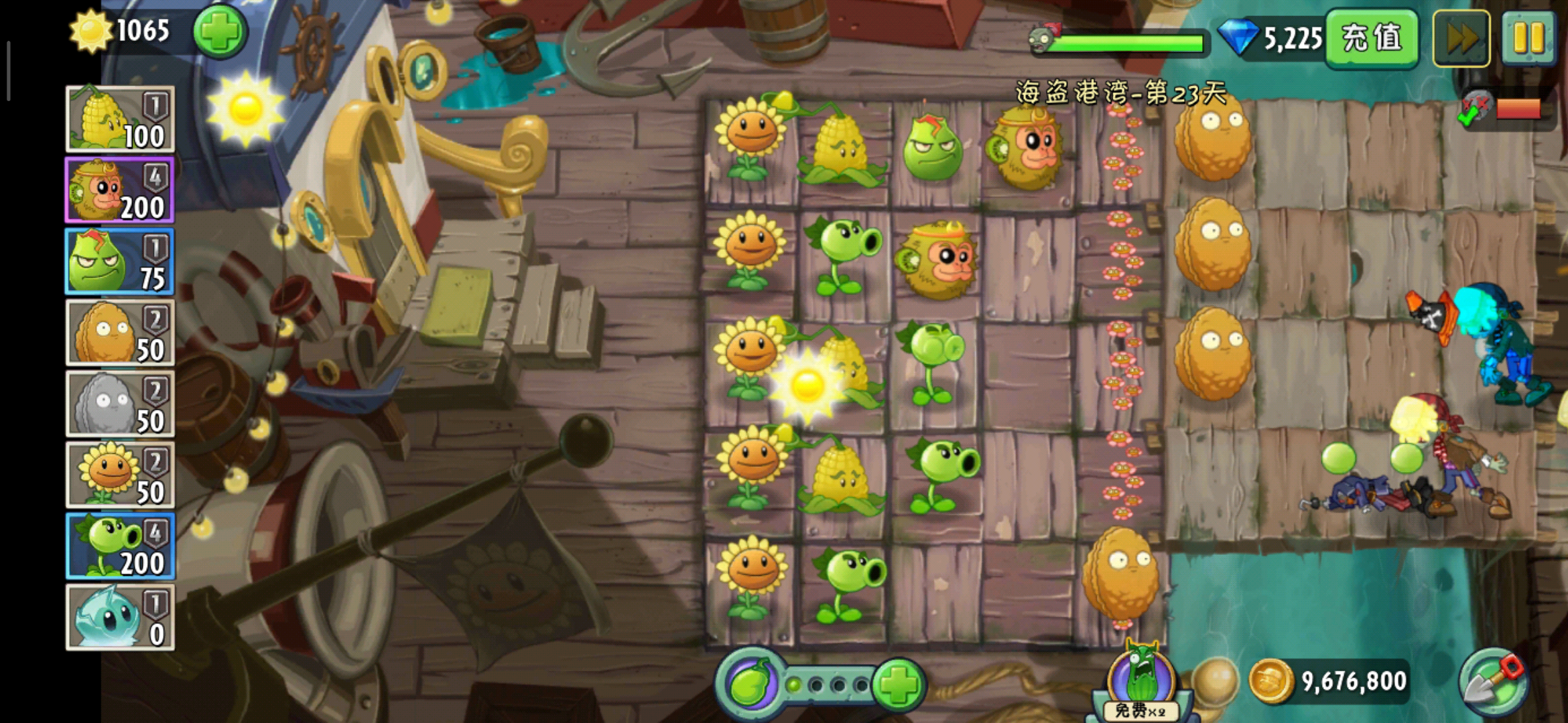 这里我们可以直接选择伤害比较高的植物,就比如说猕猴桃,双重射手这种,因为它们的太阳消耗量还是比较高的,所以说前期还是要种植消耗低的植物,这里推荐使用玉米投手,玉米投手的黄油可以将海鸥僵尸和海盗船长僵尸的鹦鹉僵尸击落。我们要注意的是,坏掉的坚果就要及时换掉,或者说在花坛前边一列就种上一列坚果,在花坛的这一列也种上坚果,这样基本就万无一失了。