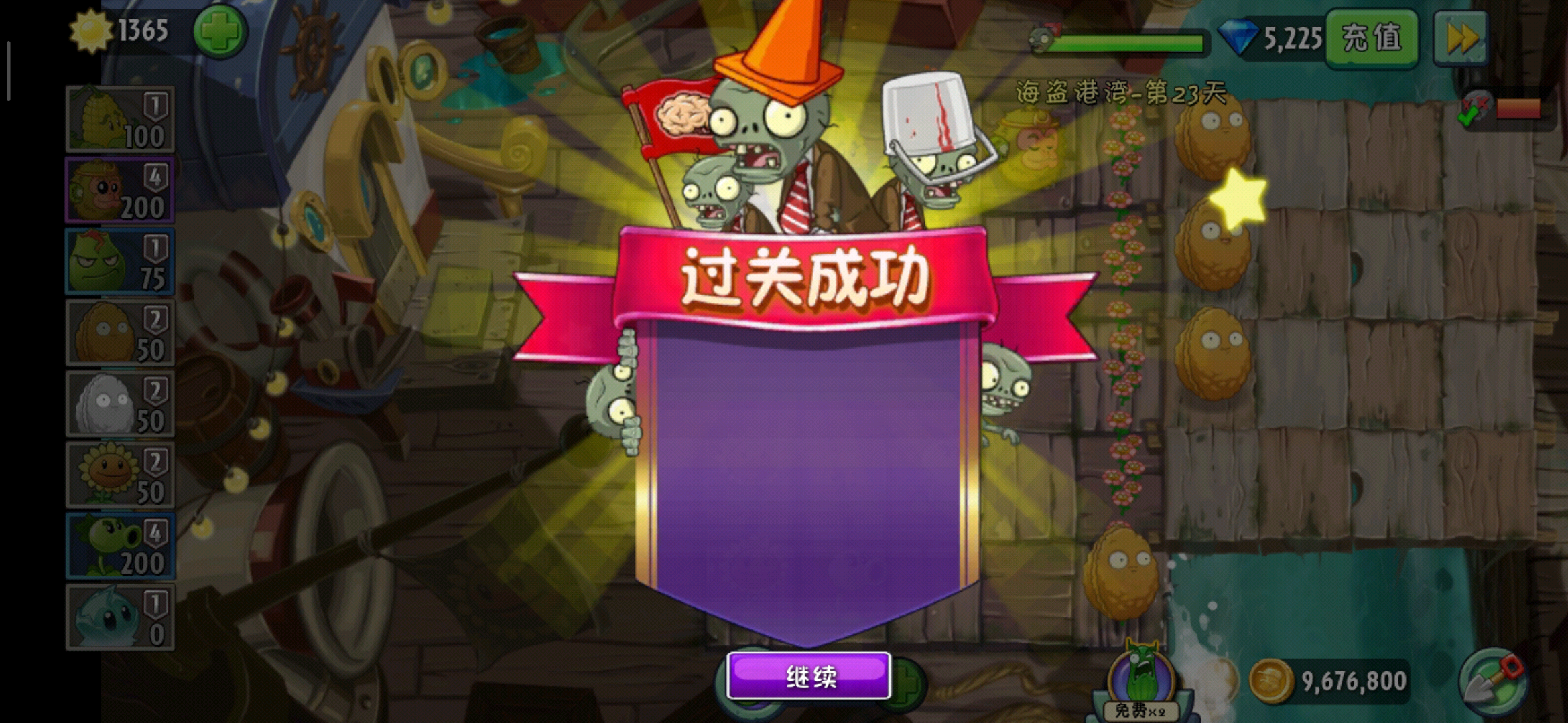 这一次出场的僵尸是海鸥僵尸和海盗船长僵尸,这两个比较棘手,剩下的是普通僵尸和路障僵尸,但是对于经历过那么多次难关的,我们这些都不是问题,无论是为了击杀任务,而是保护人,我们首先要选择坚果,然后再要选择一个变身茄子复制一下坚果,快速布置好防御防线。第一个僵尸出现在第三排,第二个是第四排,根据顺序种好坚果建立防御。