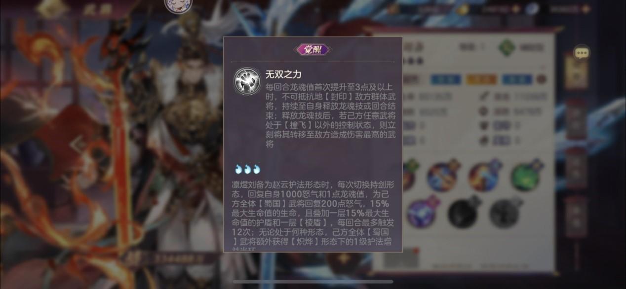 凛煜刘备的关键被动,是他能持续不断发挥效果的关键,尤其是赵云护法时,凛煜刘备的形态切换频率更高,切换的越频繁,自身能释放的怒攻和龙魂技也越频繁,同时还能加速蜀国队友的战斗力,提供源源不断的额外怒气和护盾。