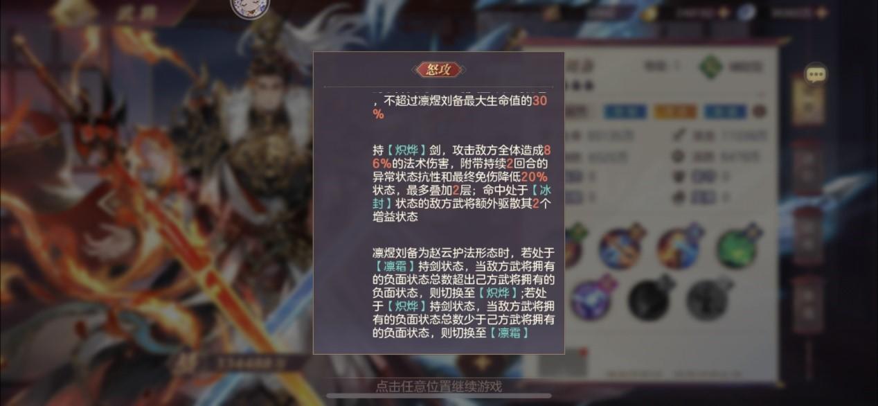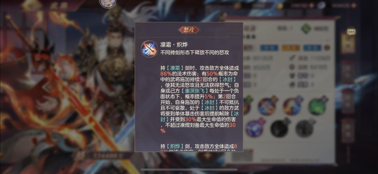 在防御姿态(凛霜)时,怒攻效果更加侧重控制,能施加非常强力的“冰封”控制效果,概率方面初始有着50%的不错概率,还能根据条件增加概率,重溟张飞在场时概率更为稳定,另外度过初始回合后,冰封获得了不可抵抗不可驱散,控制更加稳定。但是冰封控制会被单体暴击提前打破,作为补偿会给一个真伤,但是从价值来看还是控制更加实用。