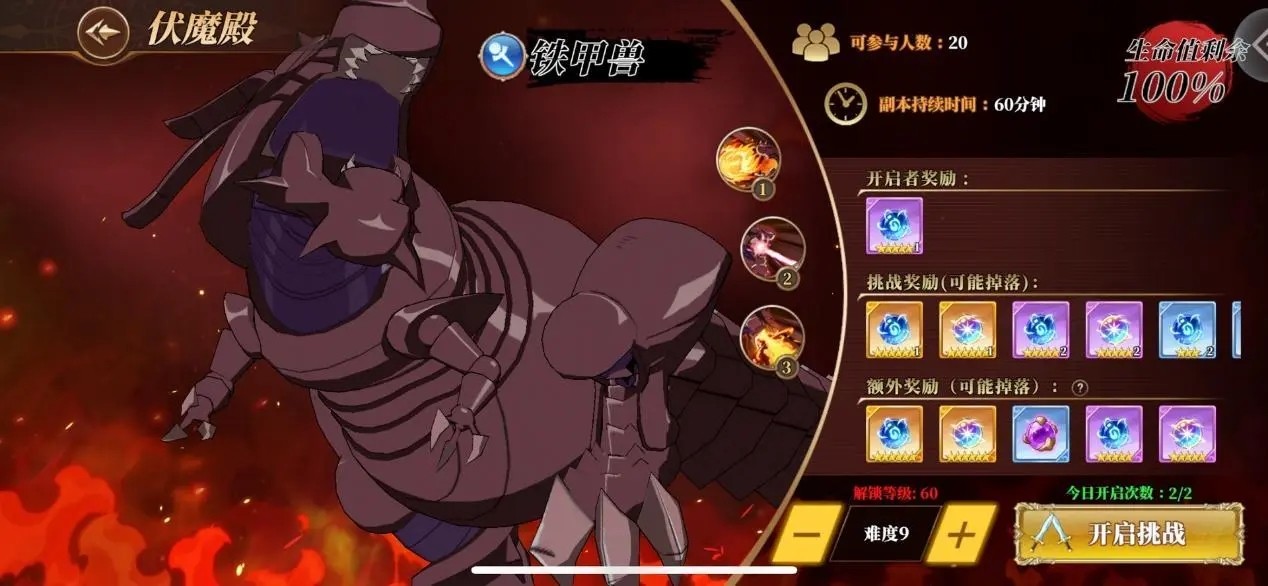 4、之前解锁的“奈落宫”、“伏魔殿”、“乐园之塔”记得持续推进,比如伏魔殿每5级解锁更高难度关卡,讨伐可获得更强力的魔法石装备,60级解锁最高难度关卡9。