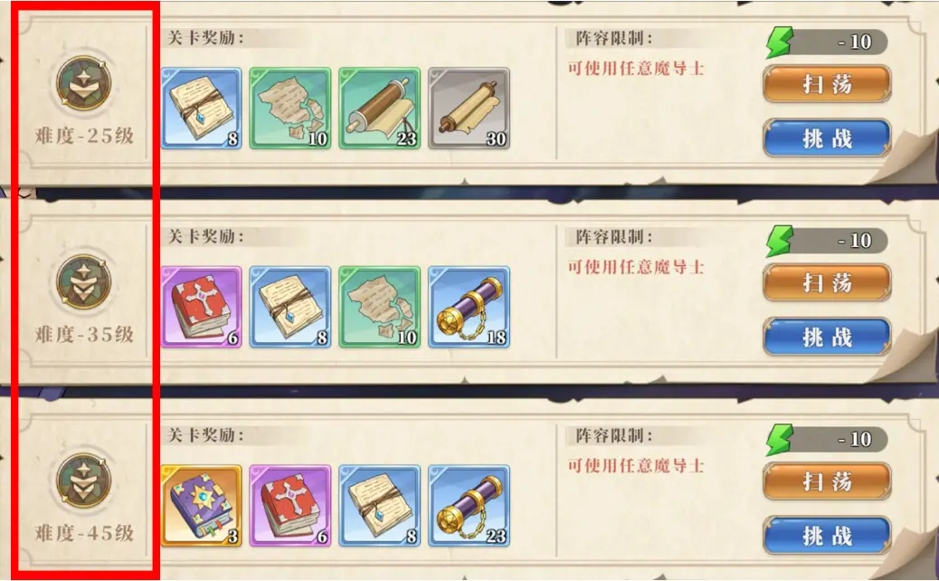 这一阶段重点是刷挑战副本攒资源提高角色战力,挑战副本限制次数且无需体力,每天要尽可能把能得到的资源都得到。