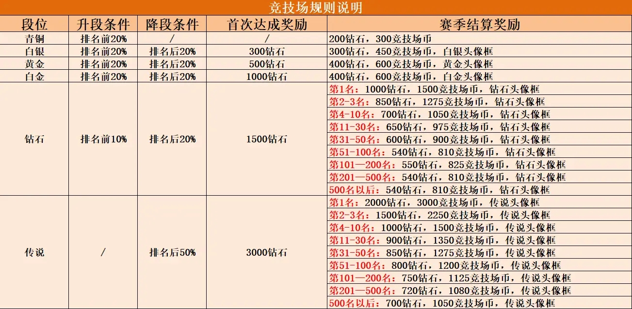 6、30-60级期间,竞技场中战斗激烈,段位排名变化快。每天免费次数10次,不耗费体力,建议都打完,保持周日结算时的排名。表中可以看出,钻石和传说段位不同排名获得的奖励差异很大!所以钻石之前保证段位在20%能升段就可以了,钻石开始要关注起自己的排名。