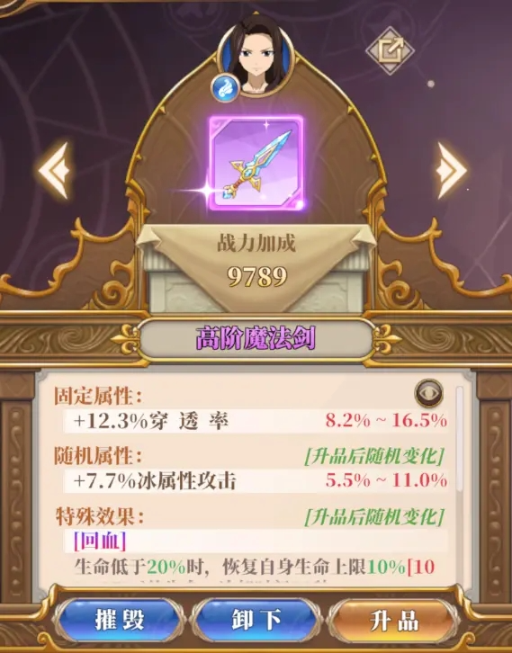 魔法装备分为主属性与副属性,蓝色及以上的魔法装备还会有特殊技能。升品会成长主属性,随机更换副属性与技能。红色、彩色魔法装备可以消耗红色魔法装备,重铸属性和技能。
