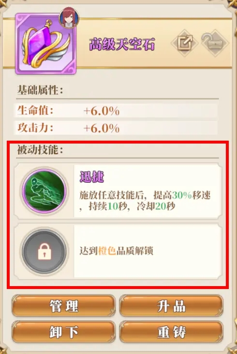 消耗指定数量同品阶技能石,天空石可升为下一品阶,升品后保留本体的被动技能。技能可以通过消耗其他材料重铸,达到一定次数可获得一次技能自选机会!