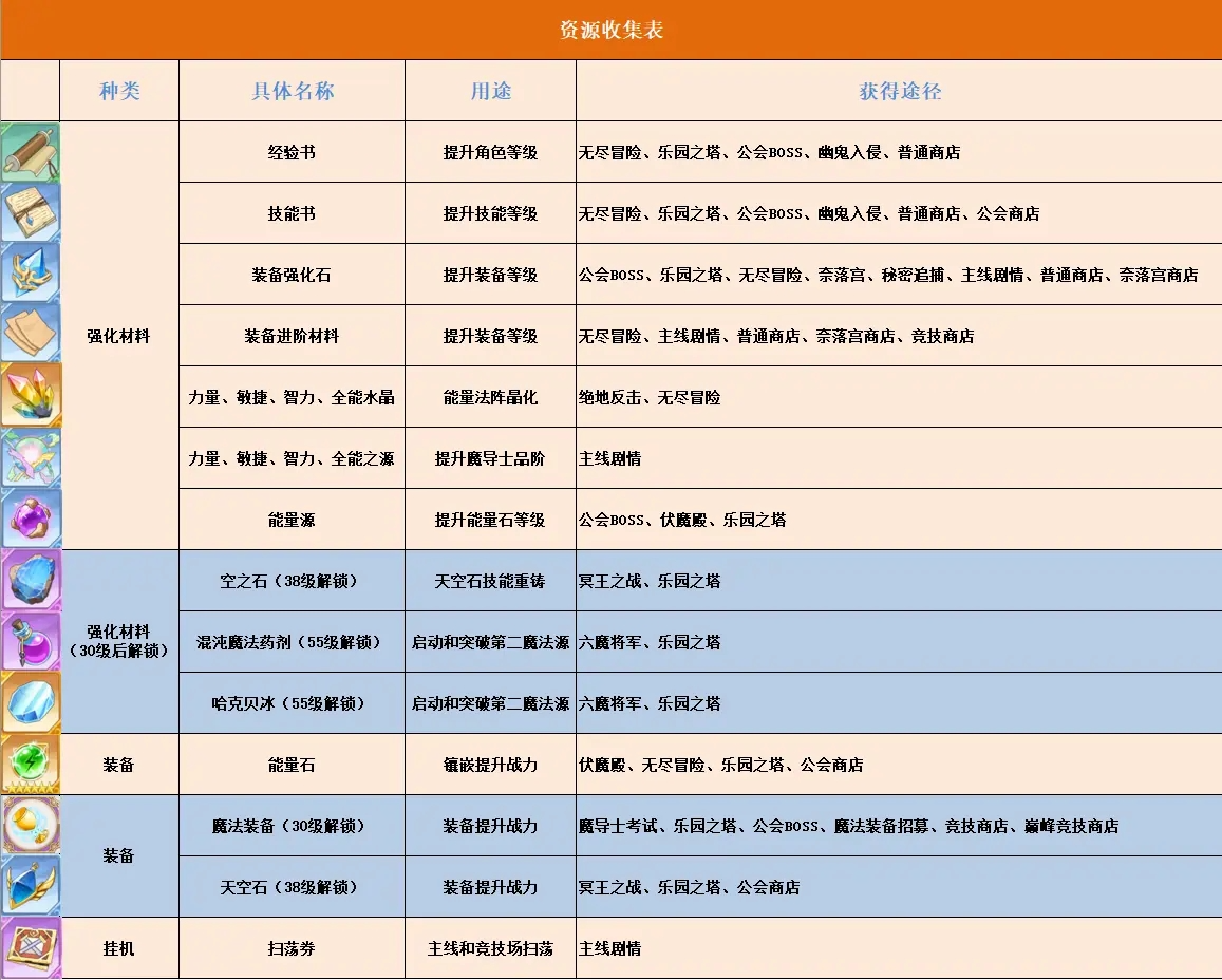 相比于游戏初期,更多系统逐步解锁(30级:魔法装备,38级:天空石,55级:第二魔法源)也需要收集相应的资源来解锁突破,具体资源收集表如下: