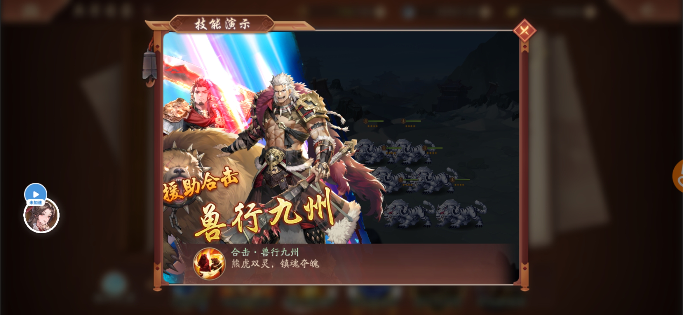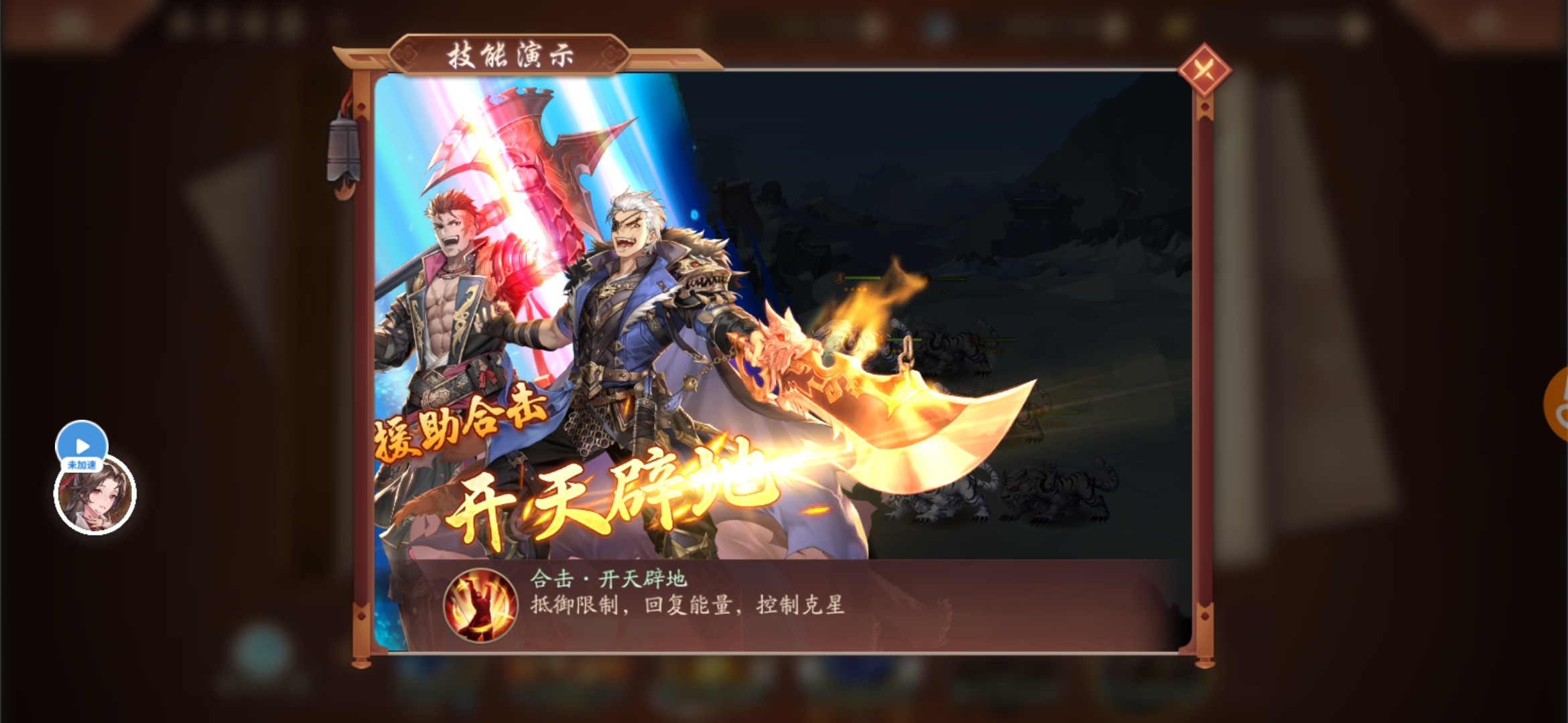 巨力震魂(携带者主动出手后25%概率使得己方下一个即将出手的武将行动失败,己方释放兵符技能时,会使得判定概率永久上升5%,最多50%。《拥有孙坚孟获 合击觉醒后激活》)