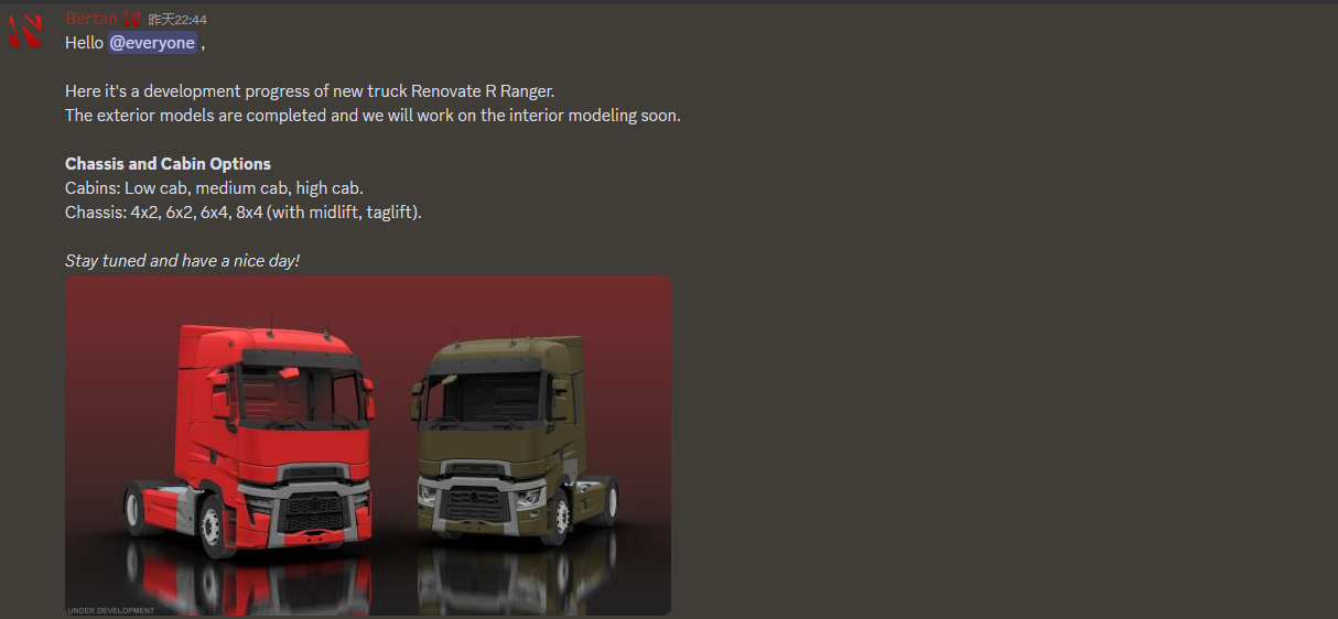 雷诺卡车外观建模现已完成,终于要上线了?光环摆渡人发布于 2023-09-01关注先别急,这次还是爆料,不是更新。据官方爆料,雷诺卡车目前已正式完成了外观的建模(是不是很帅),剩下的就是内饰建模了,小编猜测,目前内饰建模应该也在着手进行中,想必很快就能很大家见面了。 此外,这次爆料也公布了雷诺卡车的一些配件信息。底盘和驾驶室选项,驾驶室:低驾驶室、中驾驶室、高驾驶室。底盘:4x2、6x2、6x4、8x4。以下是官方原文: