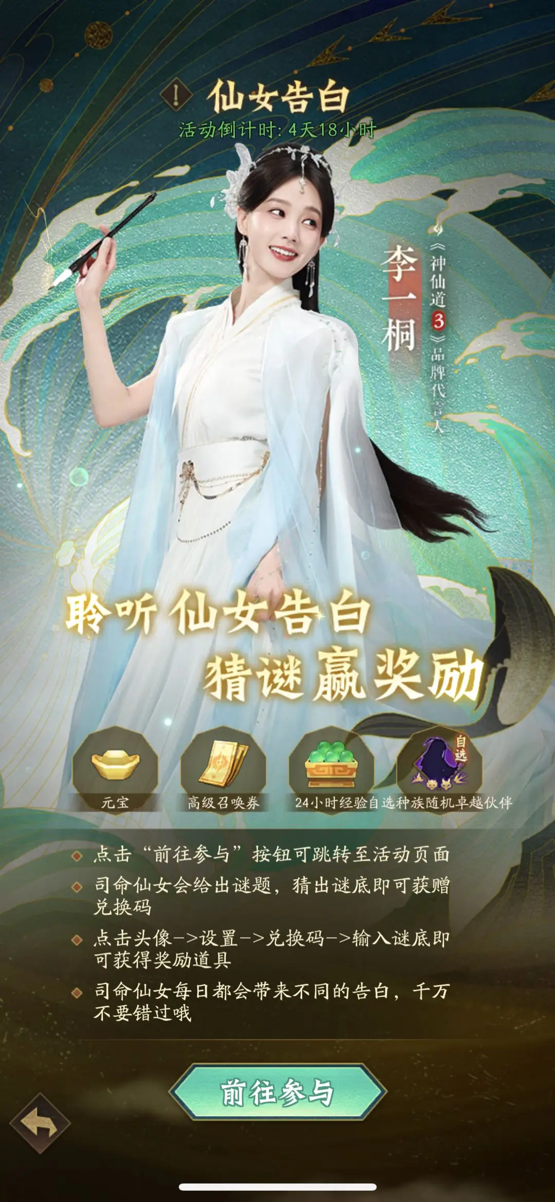 【仙女告白】活动期间,一桐姐姐每日会提出新的谜面,猜出谜底即可获赠兑换码得到一桐姐姐精心准备的高级召唤券和各类养成资源等珍稀礼物喔~