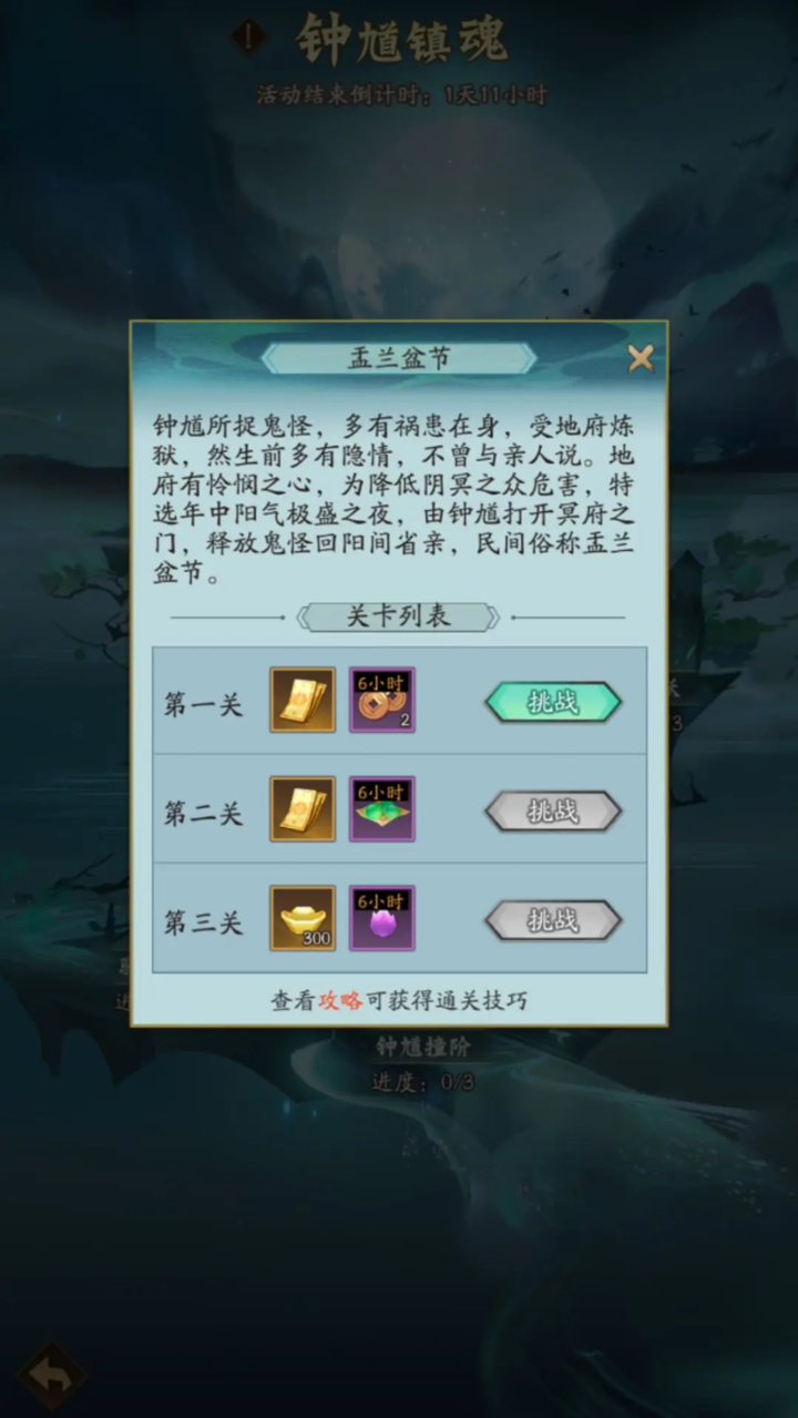 道友主线进度达到4章1回可开启活动。【钟馗镇魂】共分六个篇章,每个篇章有三个小节,首次通关小节可获取召唤券,元宝,资源小时道具。利用排兵布阵技巧,可以更快通关哦~