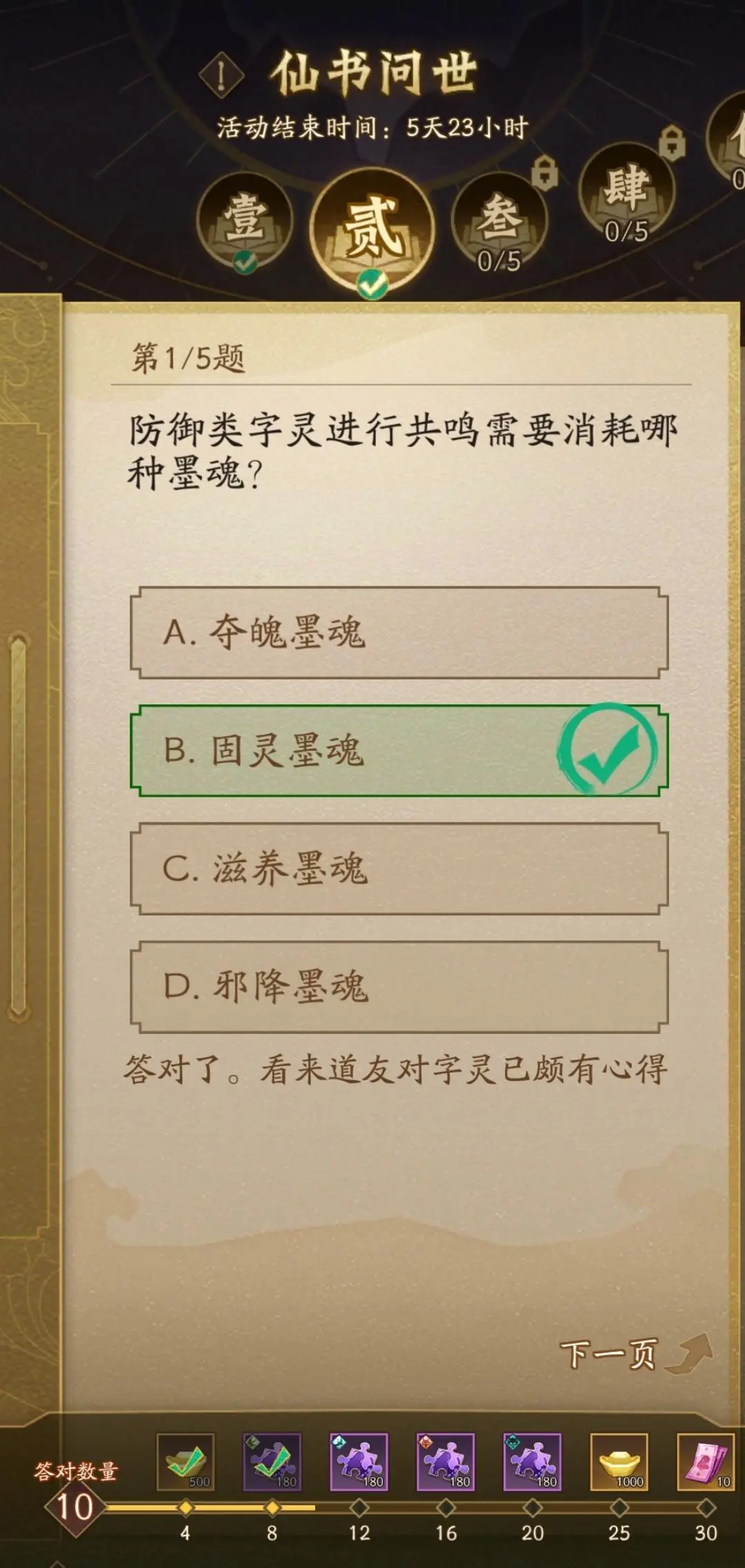 道友主线进度达到4章1回,同时服务器开服时长满14天后即可开启活动。活动期间,每天开启新一轮题目,回答正确即可领取元宝、定向召唤券、伙伴碎片等奖励。