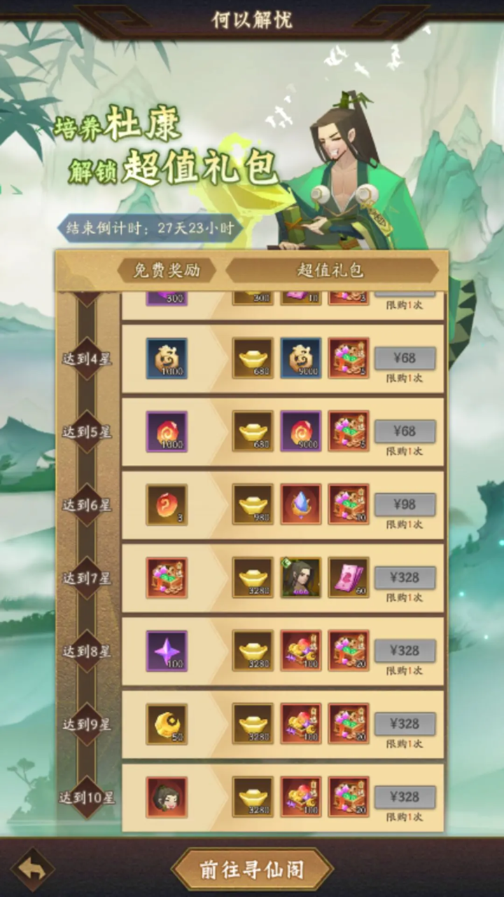 【何以解忧】活动期间,完成杜康相关的培养任务即可免费领取道具奖励,根据杜康的培养进度,可领取高级器灵、星月精华、伙伴头像等免费奖励和更可解锁超值礼包助力杜康培养平步青云!
